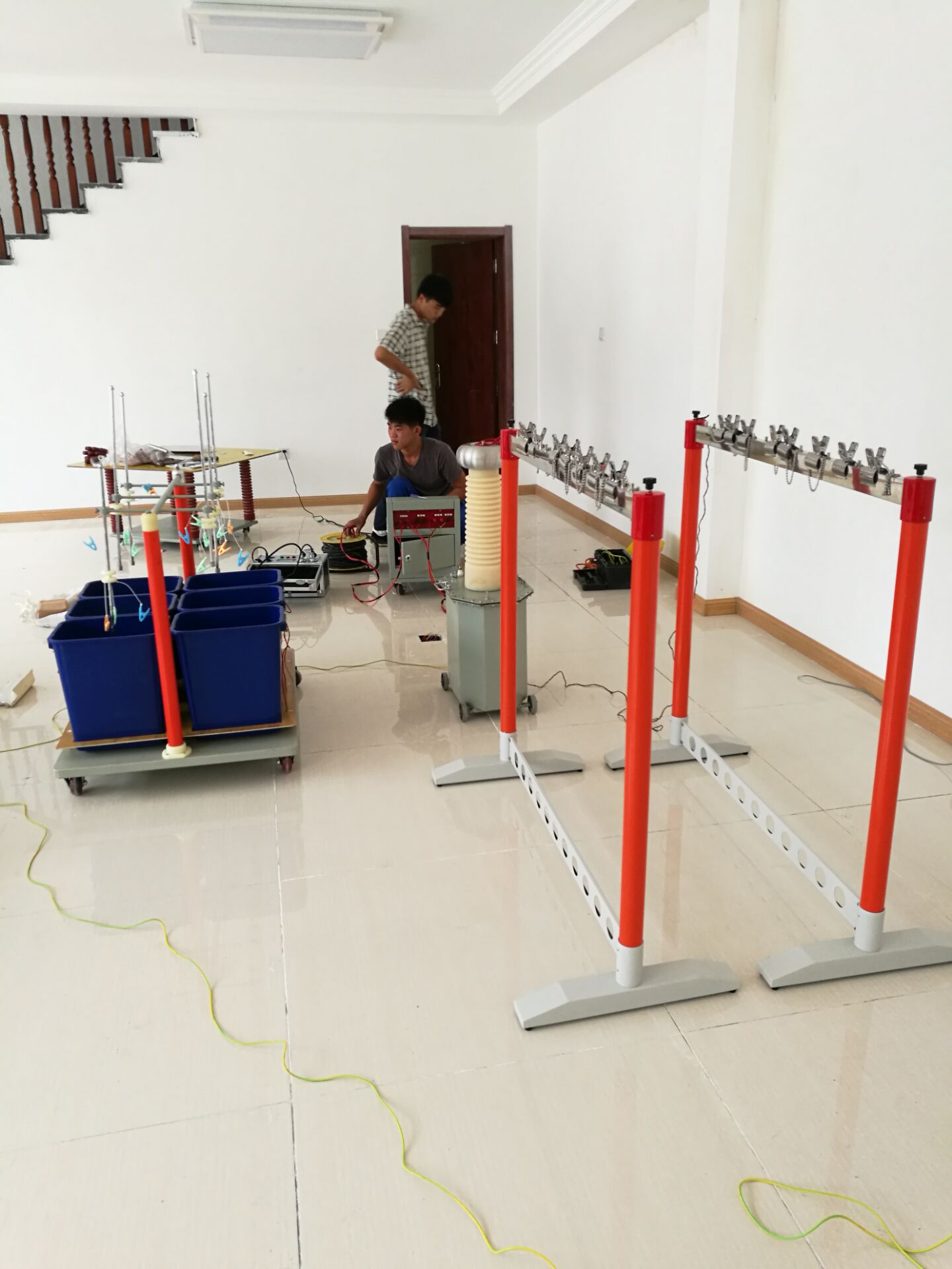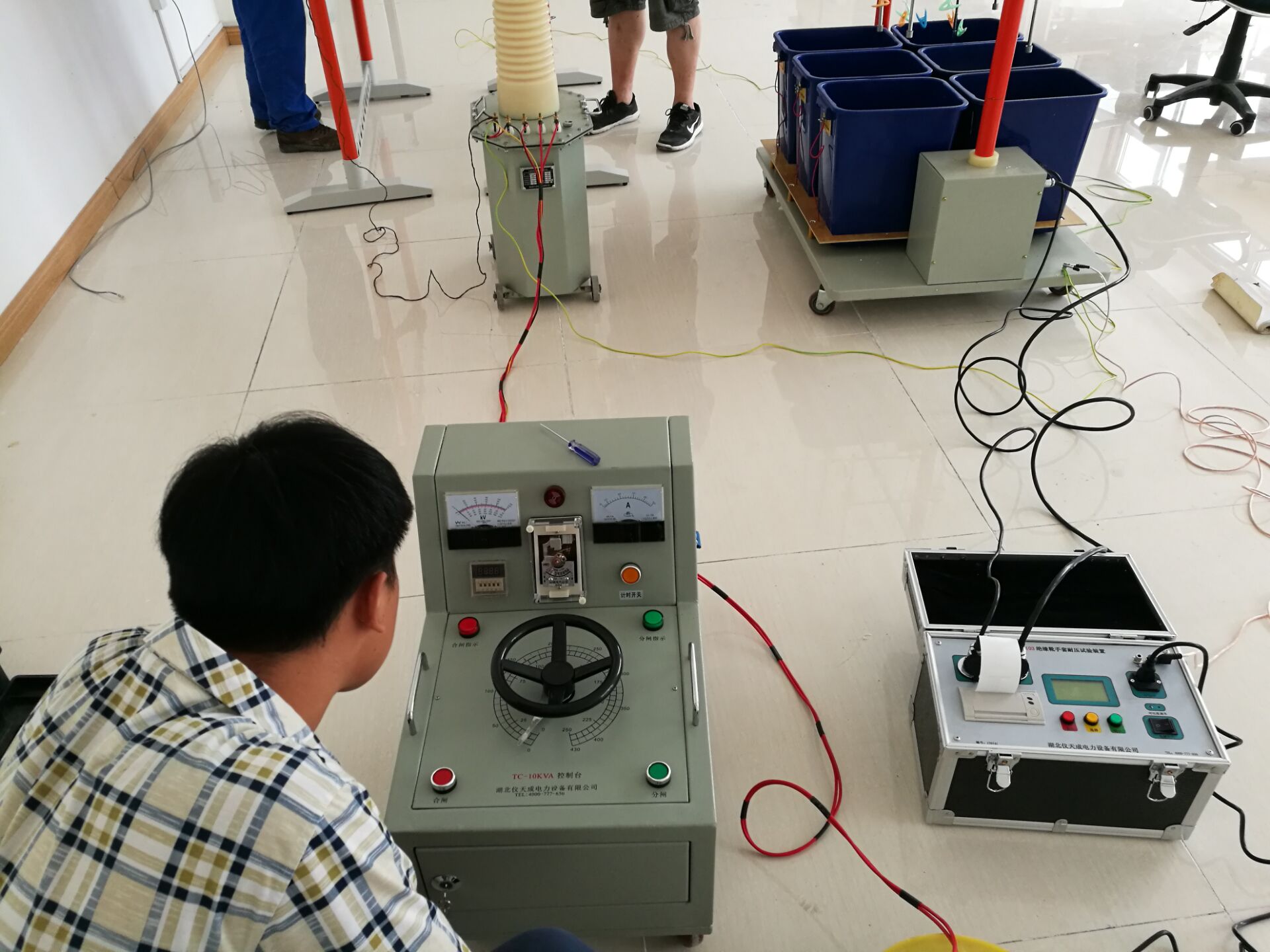 此次培訓(xùn)的設(shè)備和內(nèi)容很多,其中培訓(xùn)的主要設(shè)備是YTC1103 絕緣靴(手套)耐壓試驗(yàn)裝置。李工首先對設(shè)備的原理和功能進(jìn)行了全面而細(xì)致的講解。我公司的該設(shè)備比較先進(jìn),測試速度快,提高了工作效率;耐壓、高壓泄漏電流直讀,還可自動(dòng)識別不合格試品,智能化程度高;可同時(shí)測試4雙絕緣靴(手套),并可讀取每只的泄漏電流,準(zhǔn)確判斷不合格的絕緣靴(手套);底部裝配腳輪,可隨意移動(dòng)。非常方便。