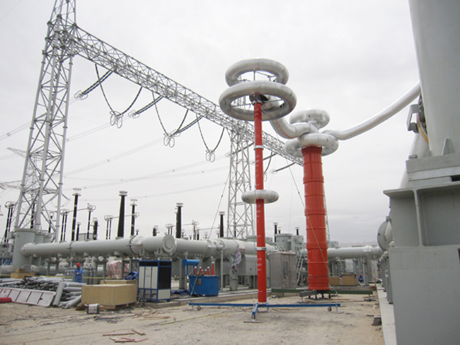 其中本次培訓(xùn)的重點(diǎn)是YTC850--5200kVA-260kV變頻串聯(lián)諧振耐壓試驗(yàn)裝置,該裝置主要針對220kV高壓套管、隔離開關(guān)的交流耐壓試驗(yàn), 220kV主變的交流耐壓試驗(yàn)設(shè)計(jì)制造。具有較寬的適用范圍,是地、市、縣級高壓試驗(yàn)部門及電力安裝、修試工程單位理想的耐壓設(shè)備。該裝置主要由變頻電源、勵(lì)磁變壓器、電抗器、電容分壓器組成,裝置具有過壓、過流、零位啟動(dòng)、系統(tǒng)失諧(閃絡(luò))等保護(hù)功能,過壓過流保護(hù)值可以根據(jù)用戶需要整定,試品閃絡(luò)時(shí)閃絡(luò)保護(hù)動(dòng)作并能記下閃絡(luò)電壓值,以供試驗(yàn)分析。整個(gè)裝置單件重量很輕,便于現(xiàn)場使用。裝置具有三種工作模式,方便用戶根據(jù)現(xiàn)場情況靈活選擇,提高試驗(yàn)速度。工作模式為:全自動(dòng)模式、手動(dòng)模式、自動(dòng)調(diào)諧手動(dòng)升壓模式.