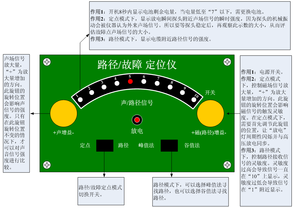 步驟2 將“定點/路徑”模式開關(guān)切換到“路徑”模式然后打開路徑/故障定位儀的電源開關(guān),開機(jī)8秒內(nèi)顯示電池電量(電量低于“7”時需更換電池?。?。