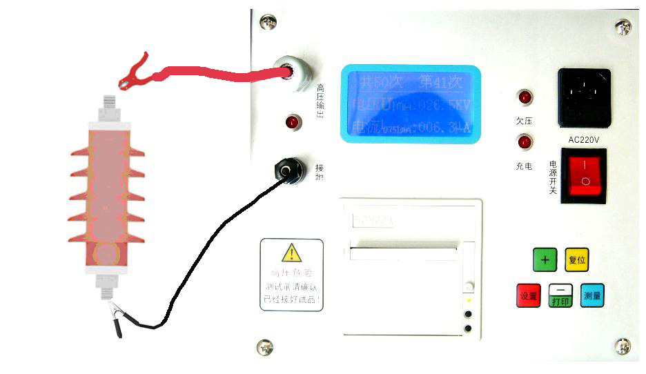 接線(xiàn):將避雷器放在絕緣性能良好的支架上,然后將測(cè)試儀的高壓輸出端接到避雷器的一端,接地端接到避雷器的另一端