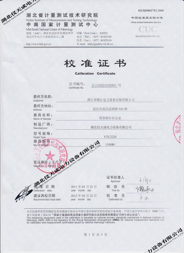 轉(zhuǎn)載:"YTC2220數(shù)字雙鉗相位伏安表的資質(zhì)證書" 請注明來源于儀天成電力。 更多技術(shù)問題請致電儀天成電力客戶服務(wù):027-87876585,技術(shù)部專線:027-87876585,在線客服:719388481